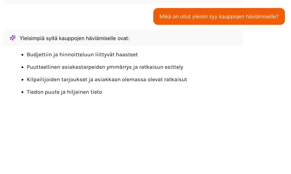 Aiemmin näiden kysymysten vastaaminen vaati kokousten läpikäyntiä, muistiinpanojen vertailua ja ehkä erillisen selvityksen tekemistä. Nyt vastaus on sekuntien päässä. Voit tehdä datapohjaisia päätöksiä myyntistrategiasta ilman, että sinun tarvitsee kaivaa tietoa käsin.